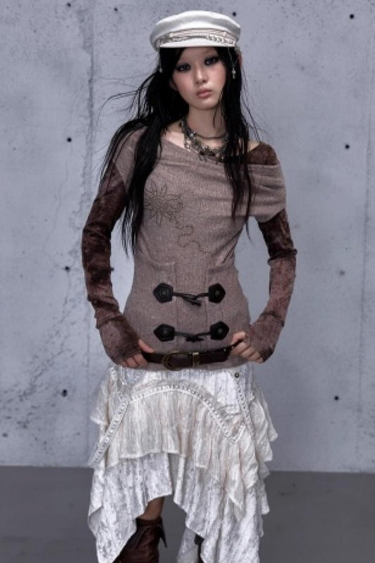 Wave Vintage Letter Embroidery Slim T-Shirt