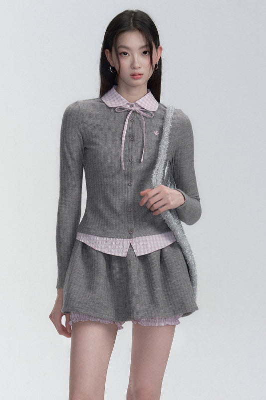 Pink-Gray Check Knit Top Set-Up