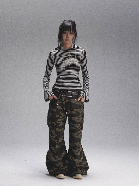 Striped print long sleeve hooded T-shirt