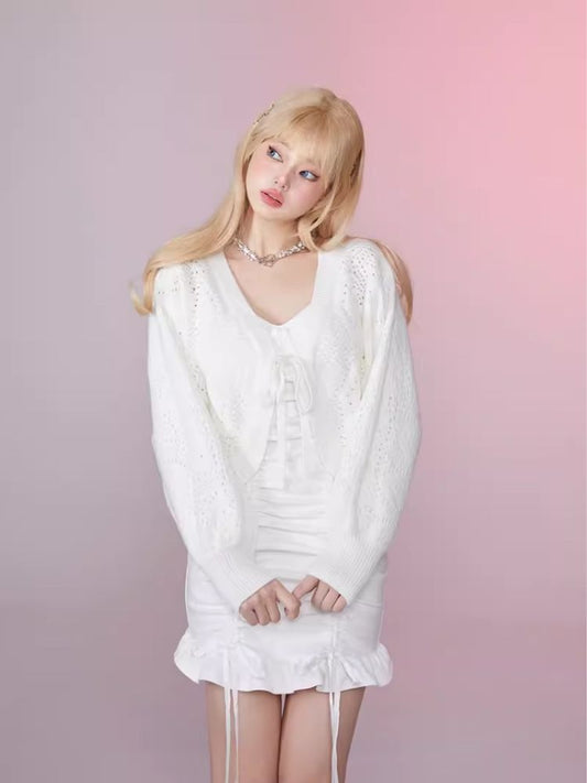 Bat Sleeve Short Tie Crochet Skeleton Knit Cardigan