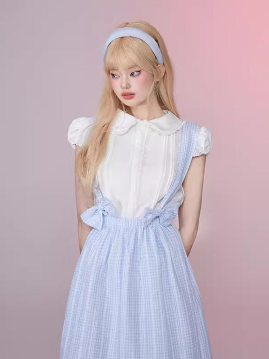 Plaid Bow Tie Back Dress Lace Shirt Set
