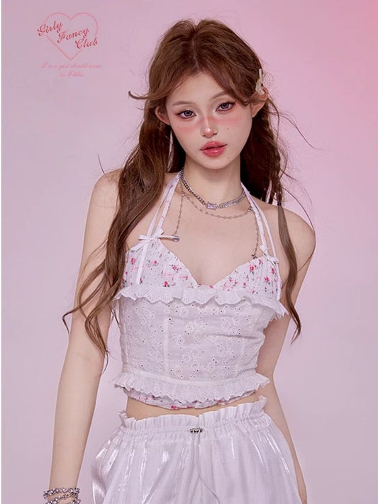 Embroidery Hollow Lace Bow Tie Top