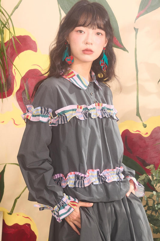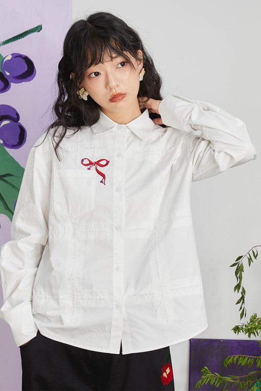 Retro Bow Embroidery Long Sleeve Shirt