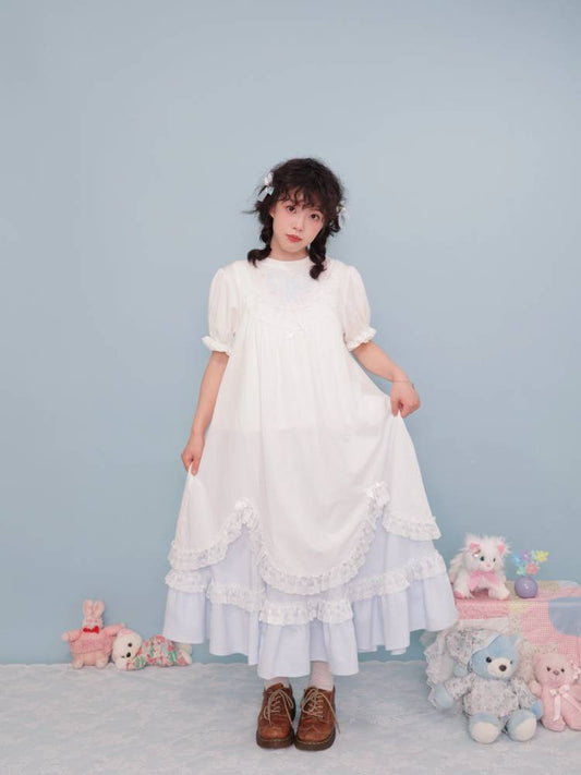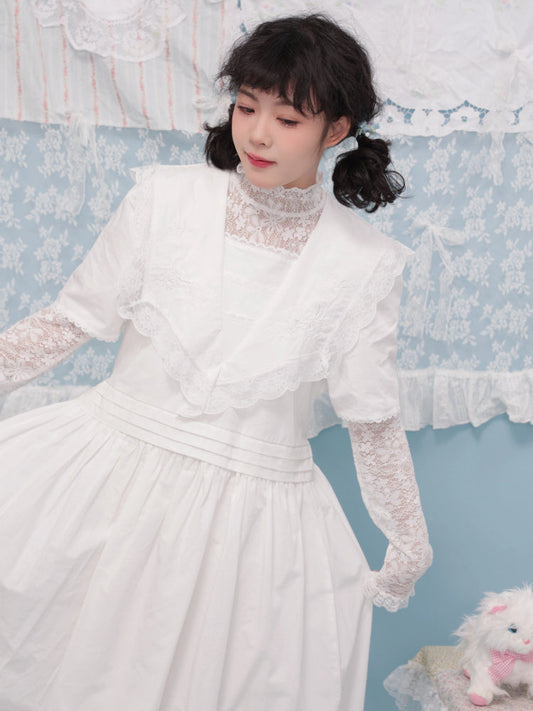 Antique girly pleated embroidery white dress