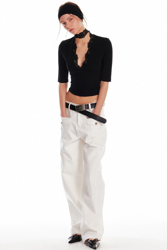 Schwarzes Spitzenoberteil mit V-Ausschnitt und Fünf-Minuten-Ärmeln