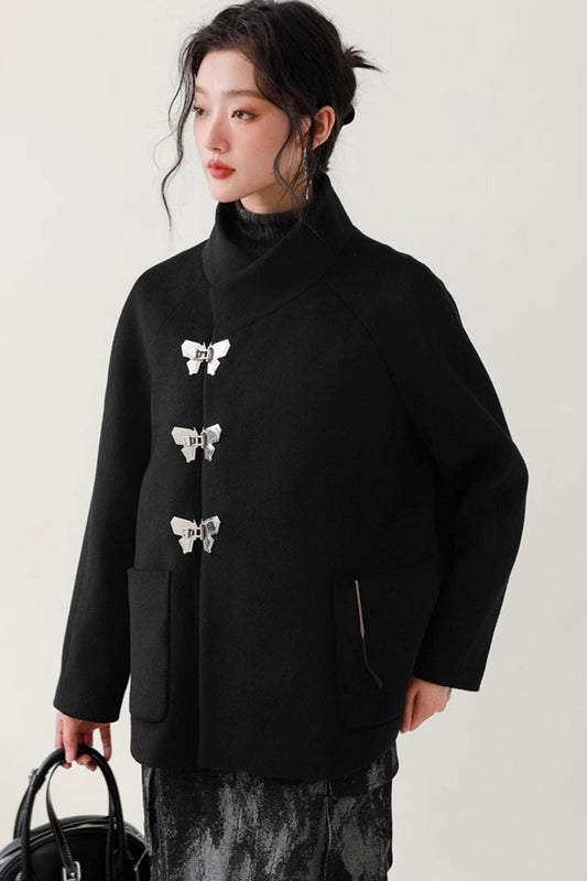 Schwarzer Wollmantel mit Schmetterlingsschnalle
