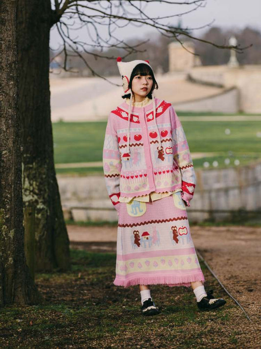 Bär und Hase spielen Haus – Strickjacke/Rock mit buntem Streifenmuster