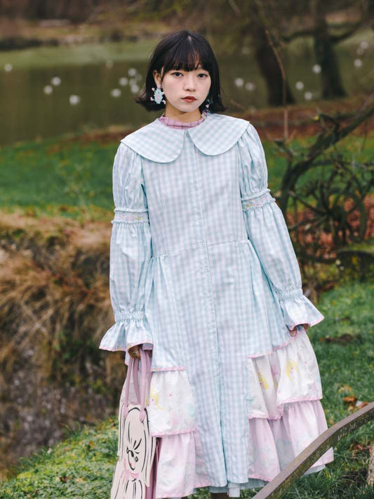 Gestuftes Kleid mit Engelsmuster, karierten Spleißen und Rüschen