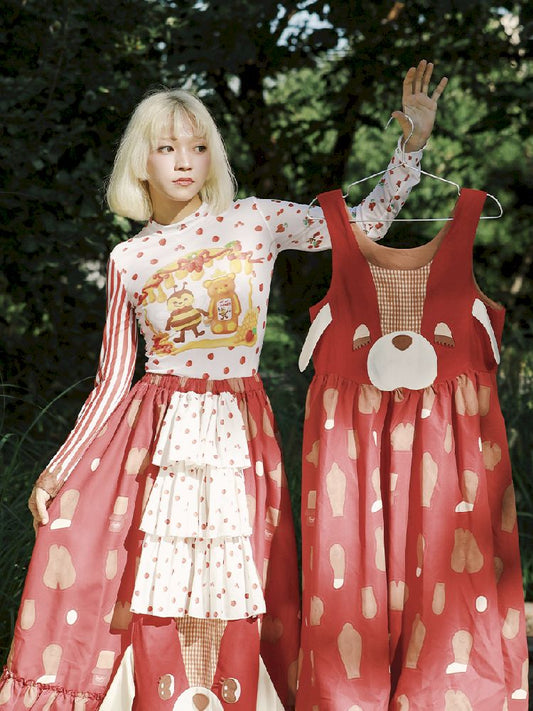 Mehrlagiges Schürzenkleid mit Katzenstickerei, Kordelzug und Herz
