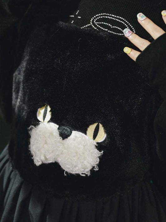 Schwarzes Spitzenschürzenkleid mit Katzenstickerei