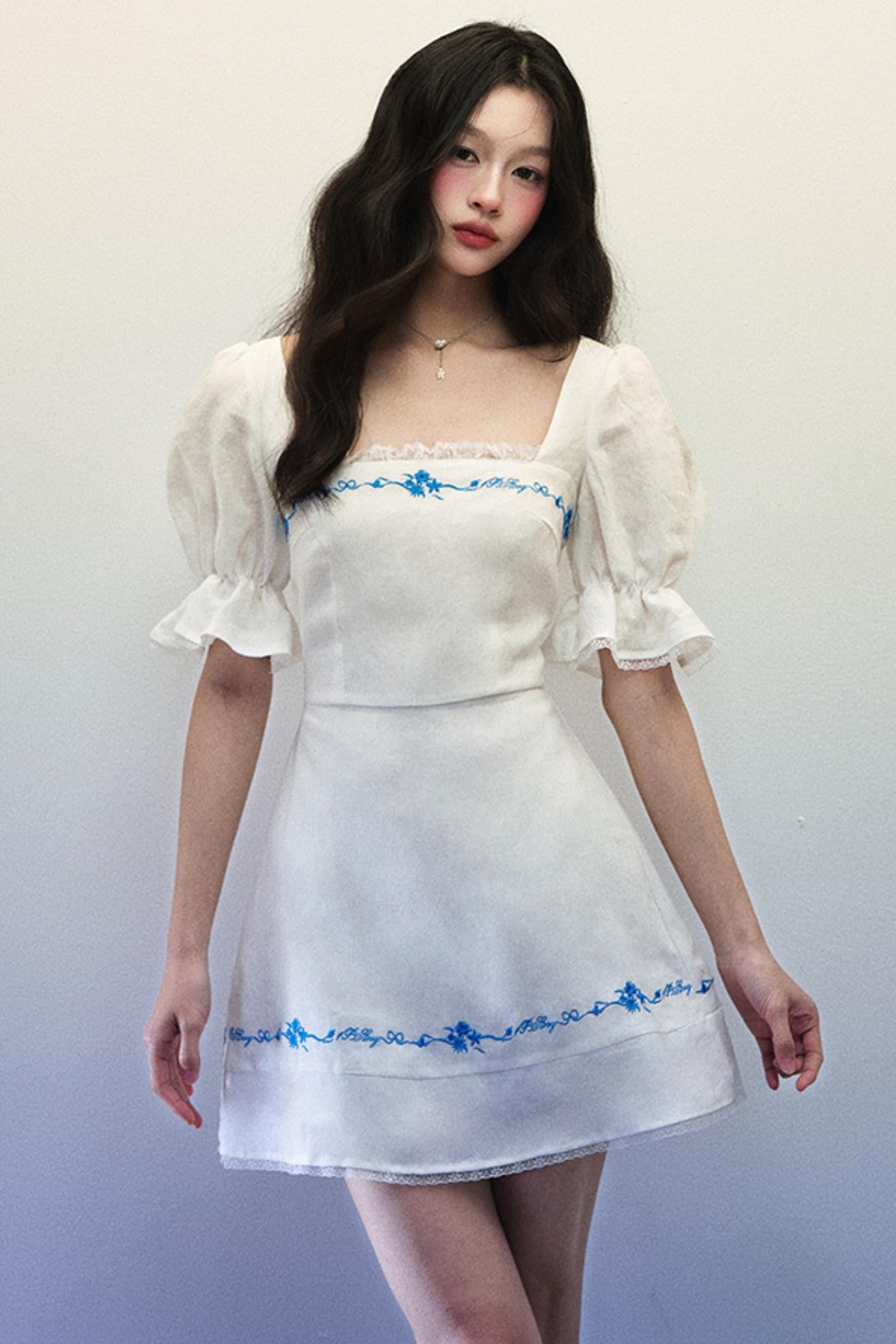 Embroidered Blue Linen Summer Dress