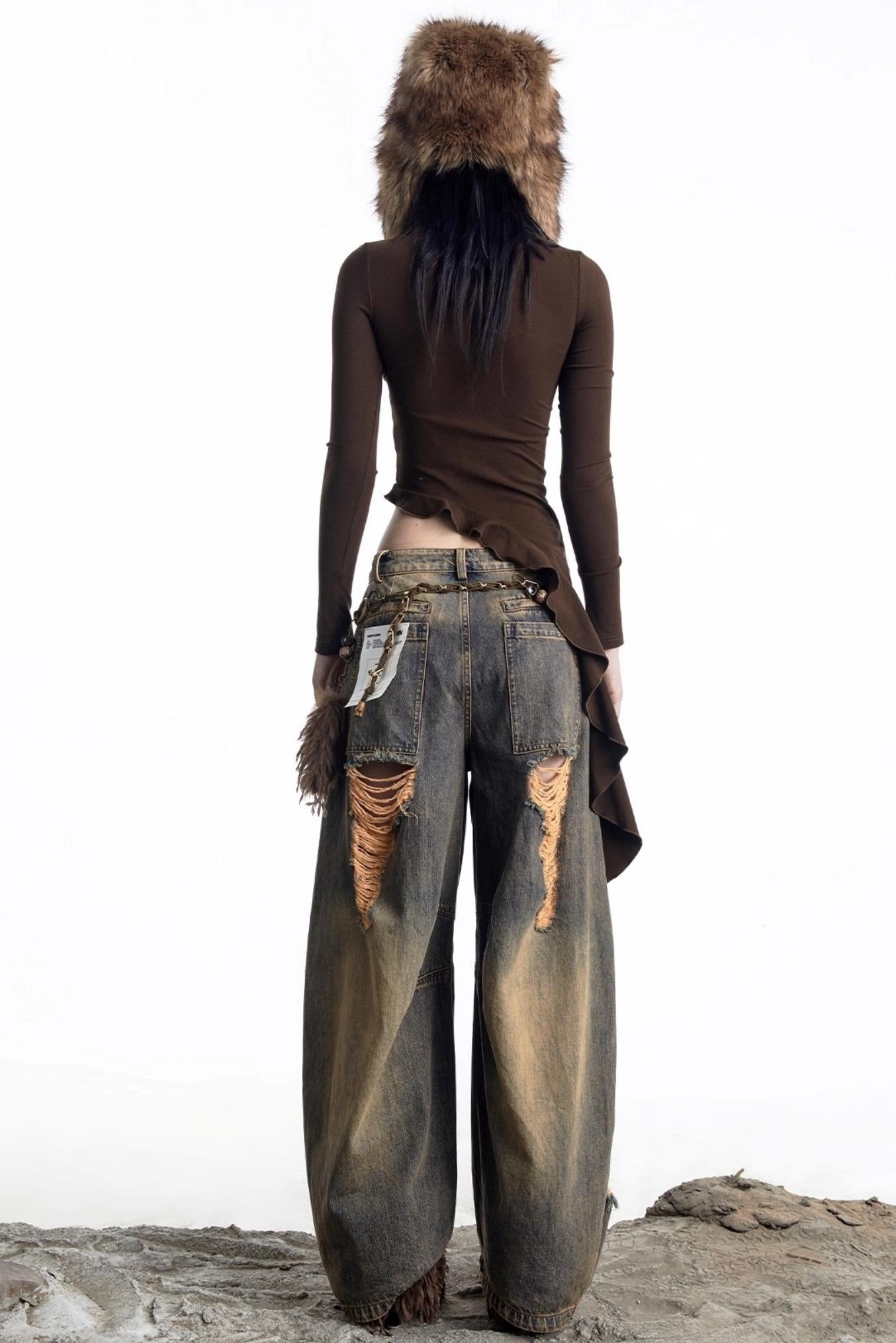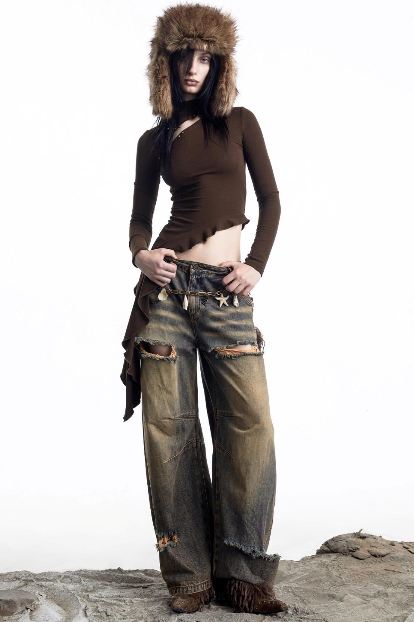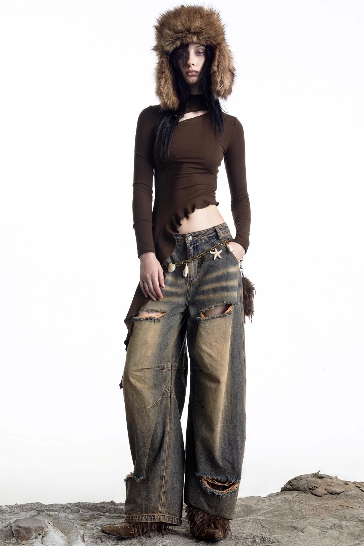 Openwork Rivet Ruffled Knit Top