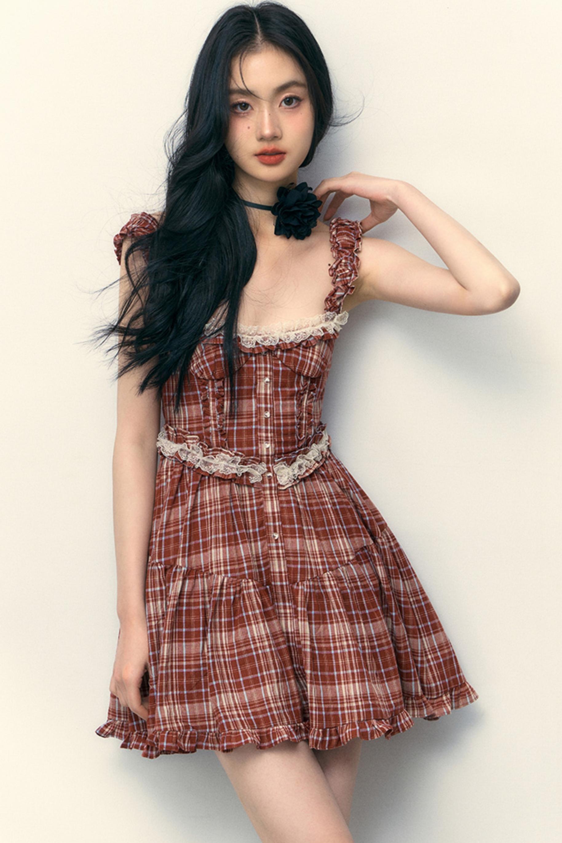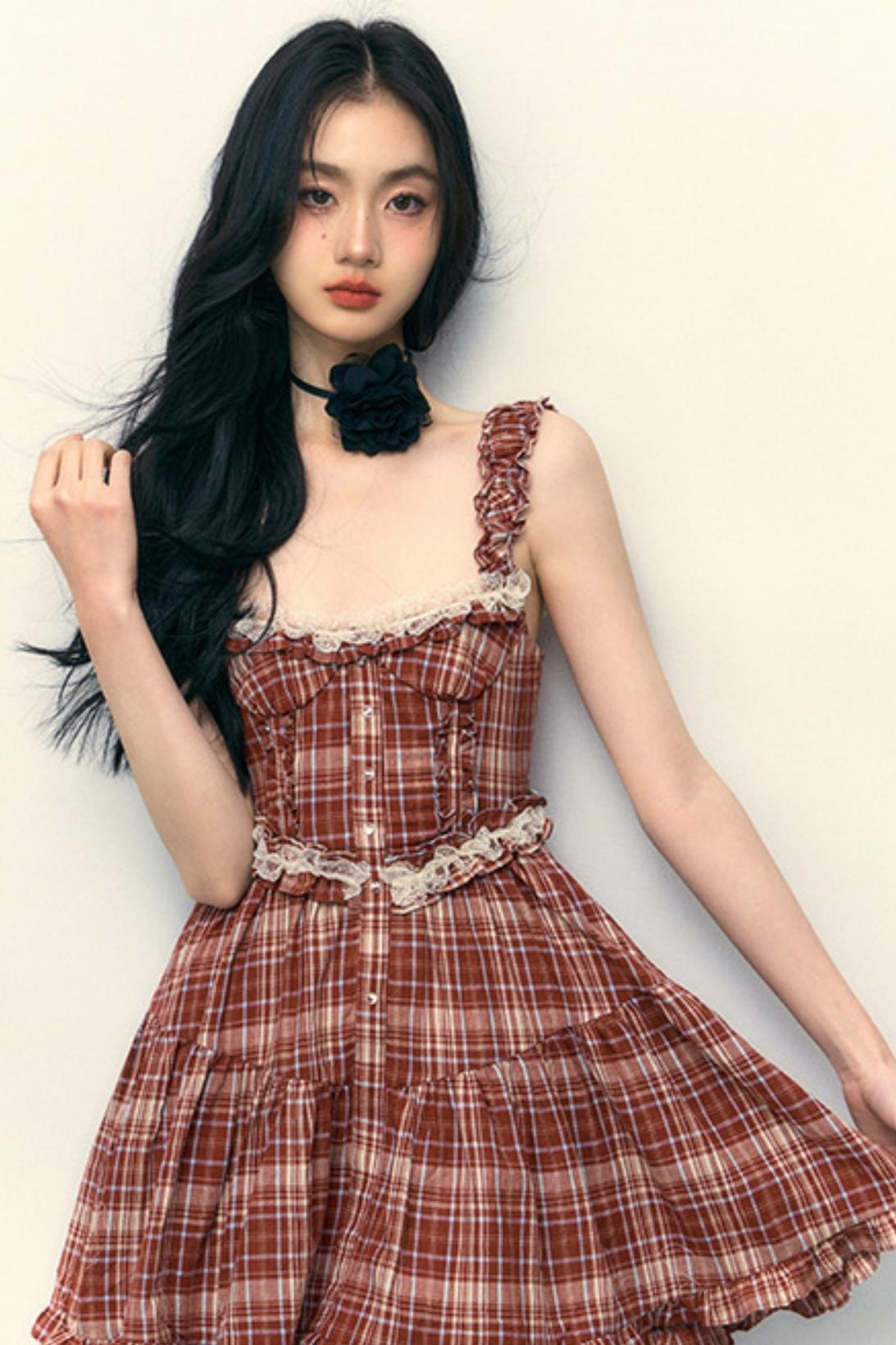 Pink Plaid Ruffle Lace Cami Dress