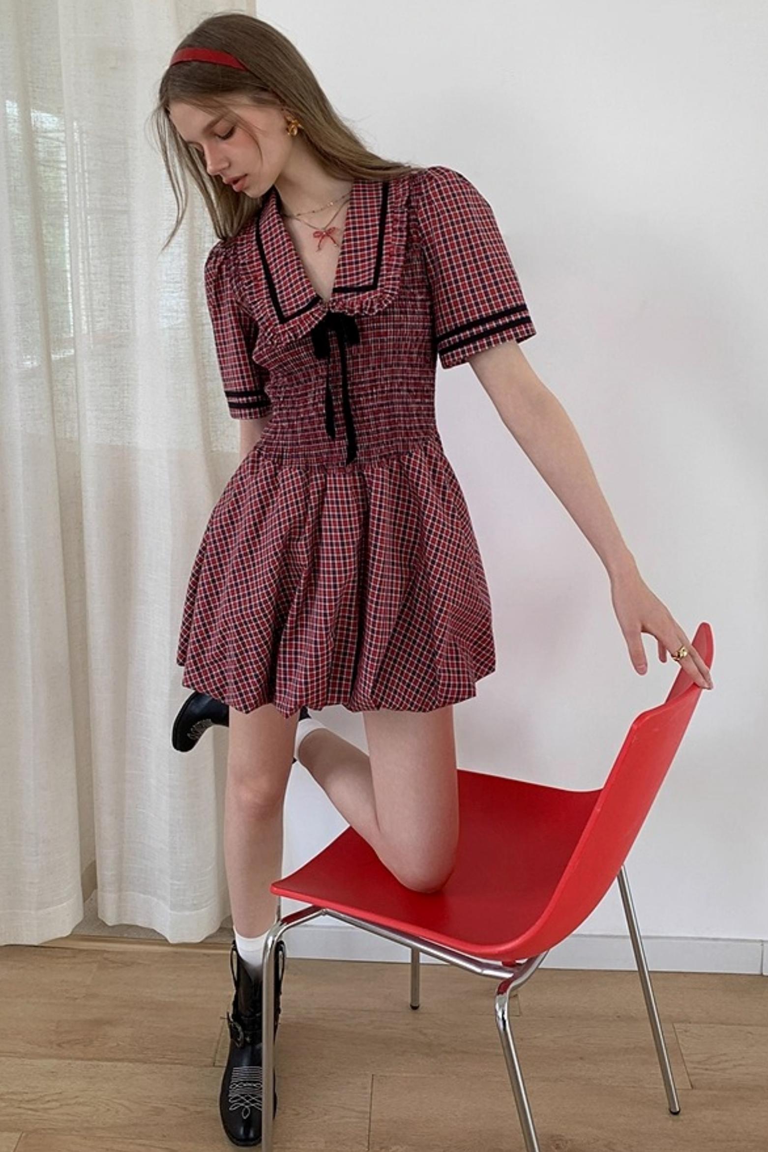 Plaid V-neck Bow Bubble A-Line Bud Dress