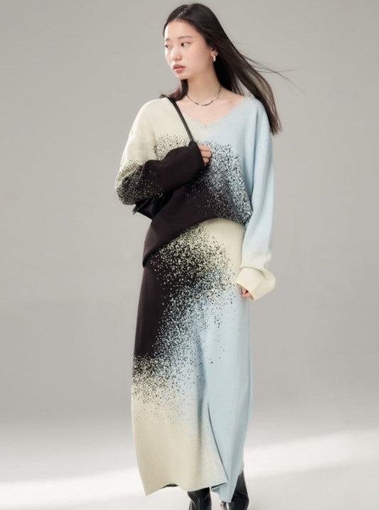 Gradient V-Neck Sweater Knitted Tops Skirt Set