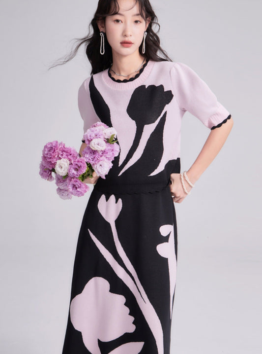 Pinky Tulip Short Sleeve Knit T-Shirt Skirt Set