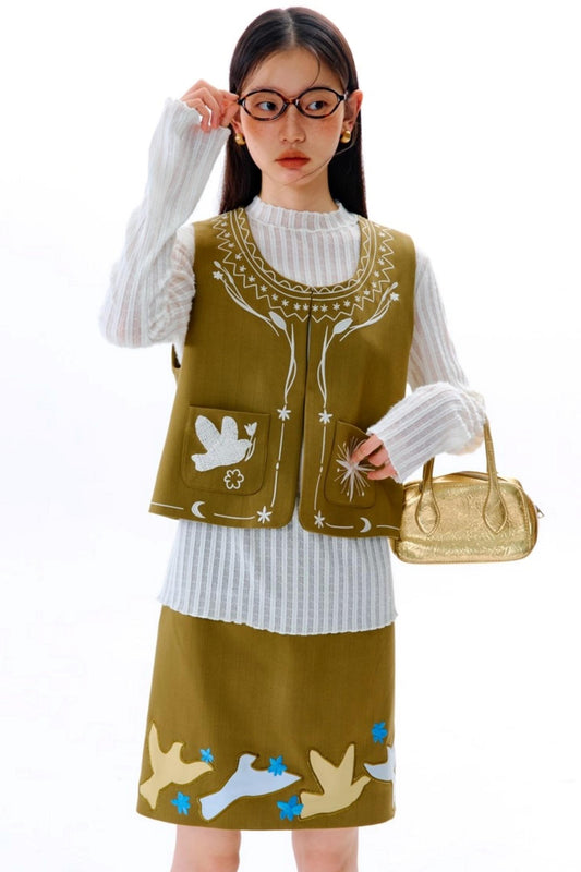 Bright Star Vintage Bird Embroidery Wool Jacket Set-Up