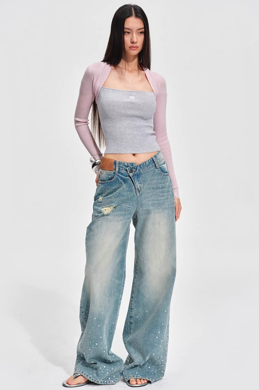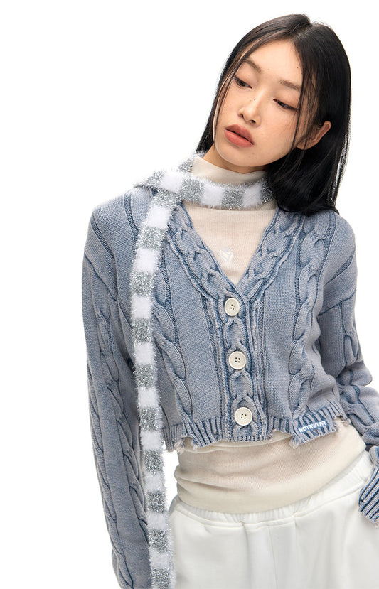Damaged design washed collar short cardigan
