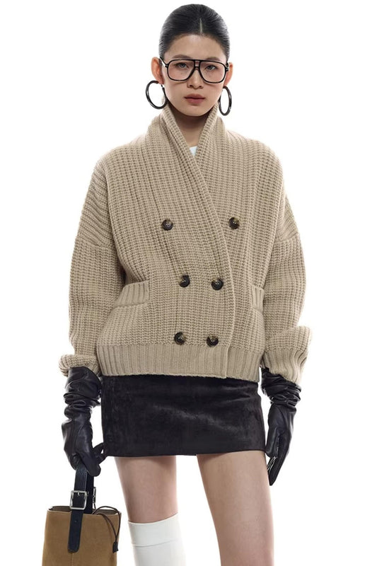 Camel Double-Breasted Knit Cardigan