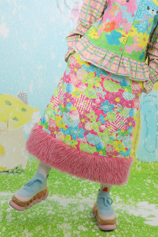 Pink check print denim skirt