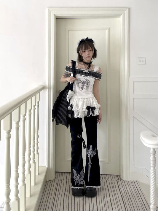 One Neck White Plaid Lace Angel Skull Short Short Sleeve T-Shirt