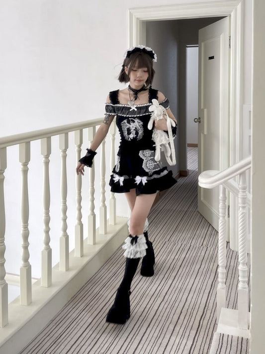Black Angel Skull Printed Short T-Shirt Halter Dress Set