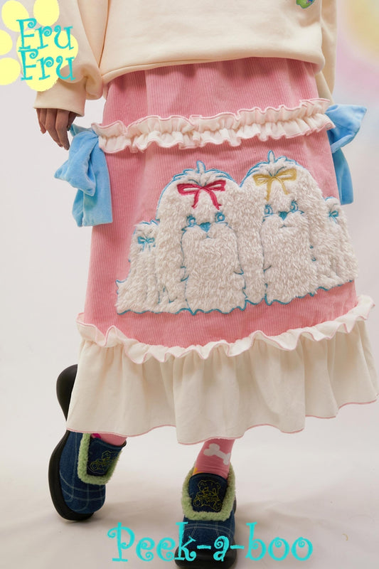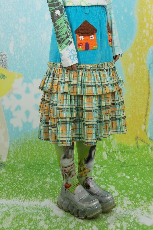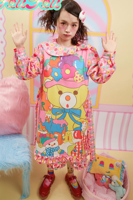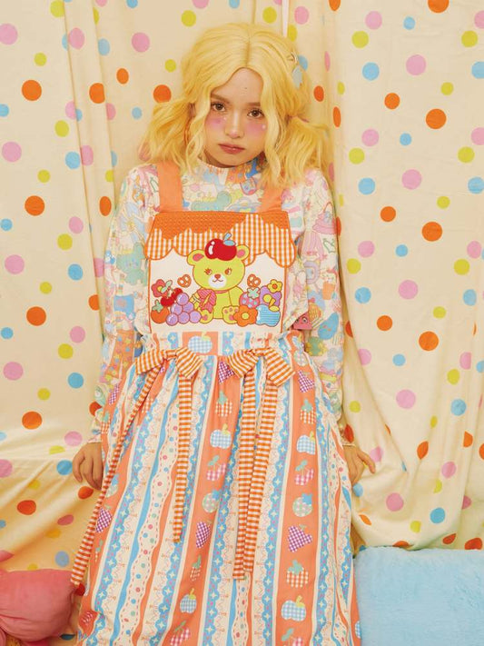 Cartoon Bear Plaid Splicing Embroidered Apron Dress