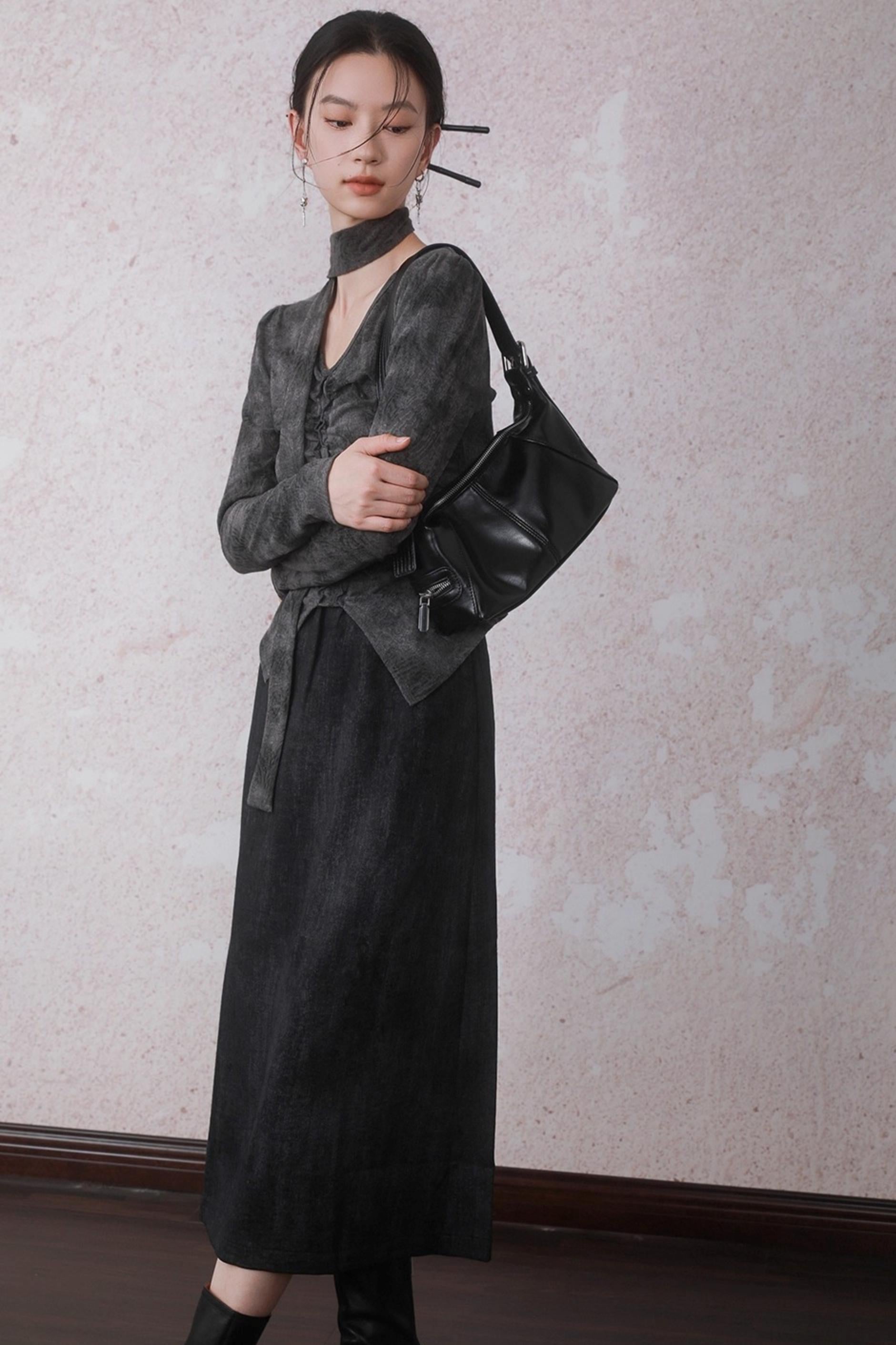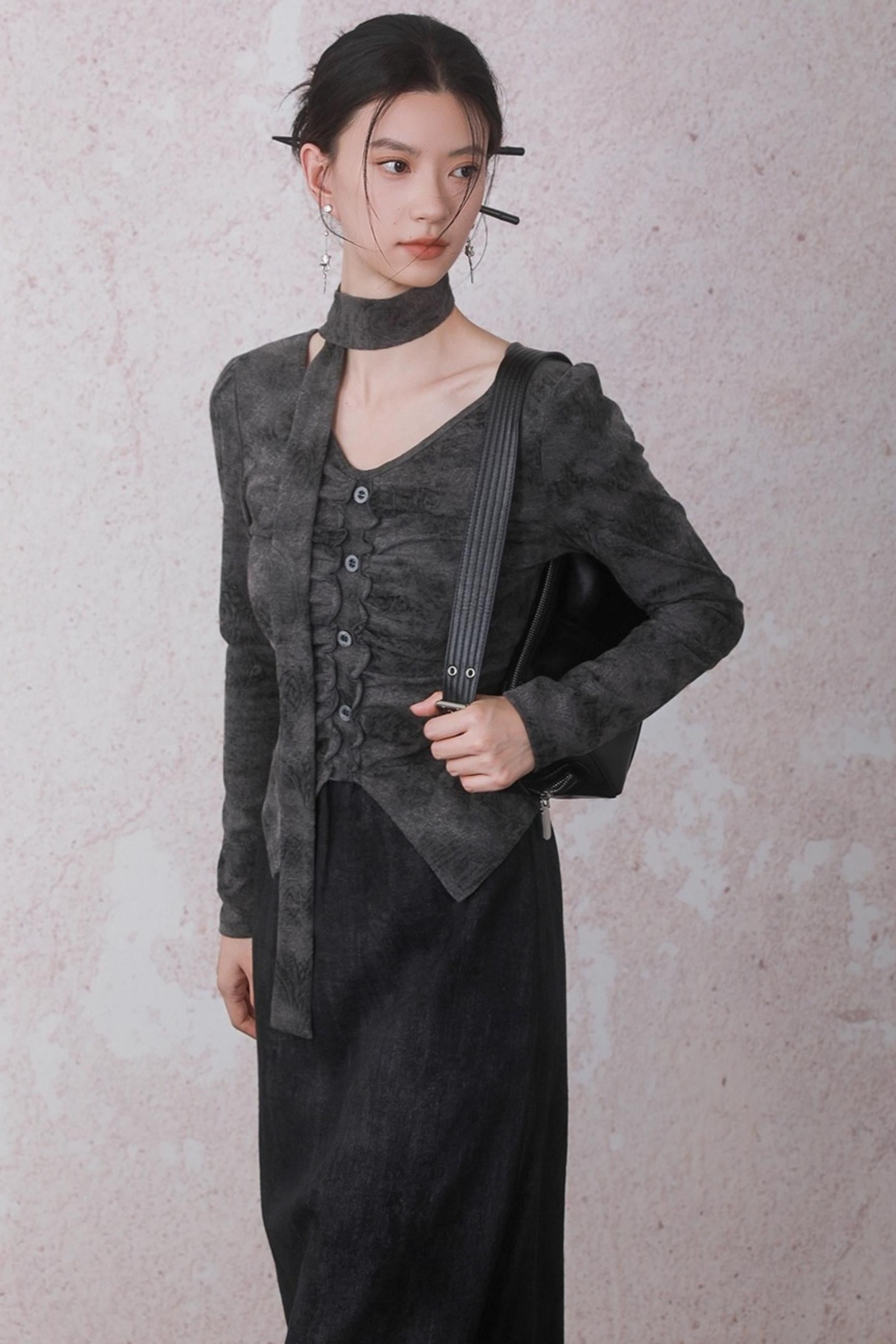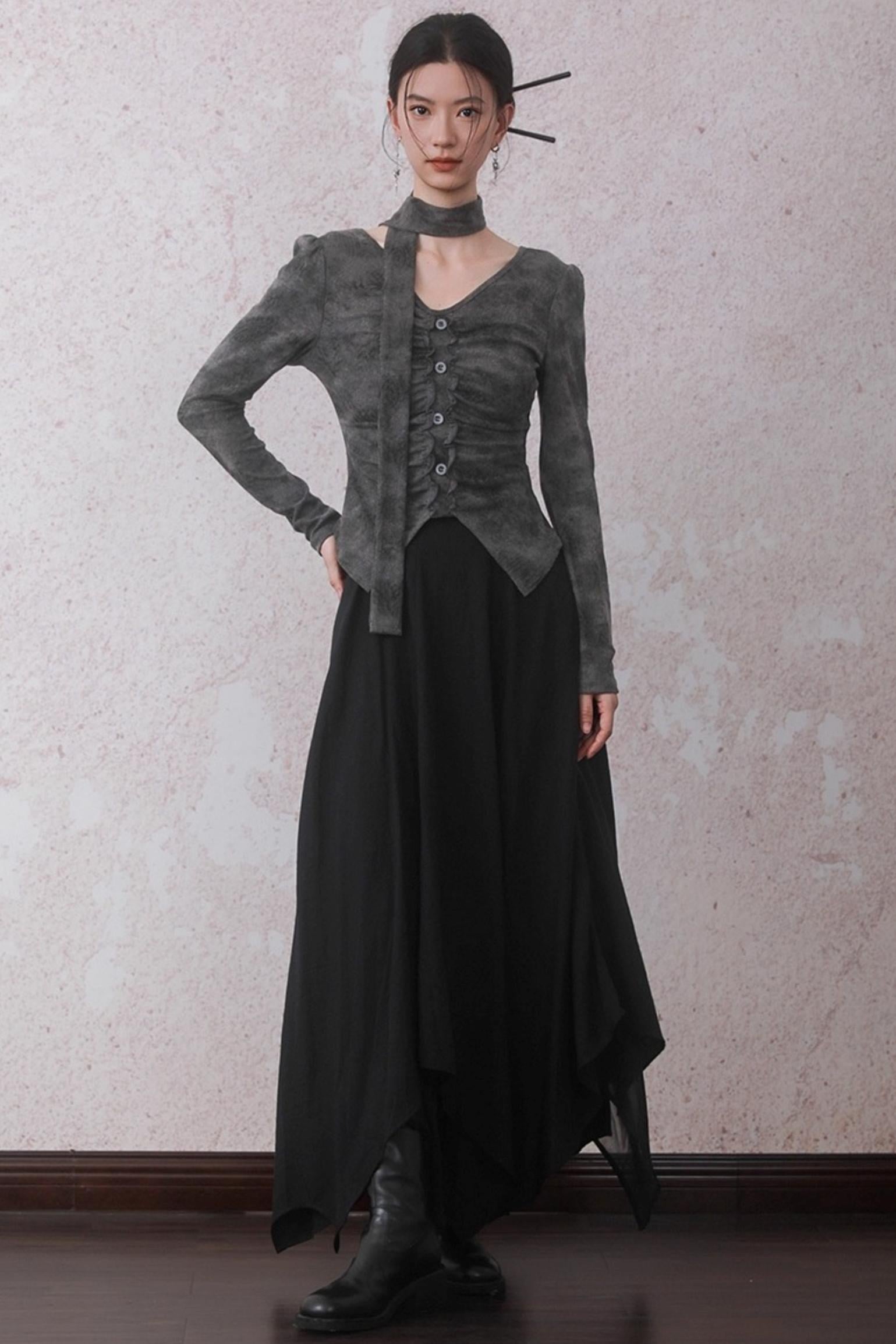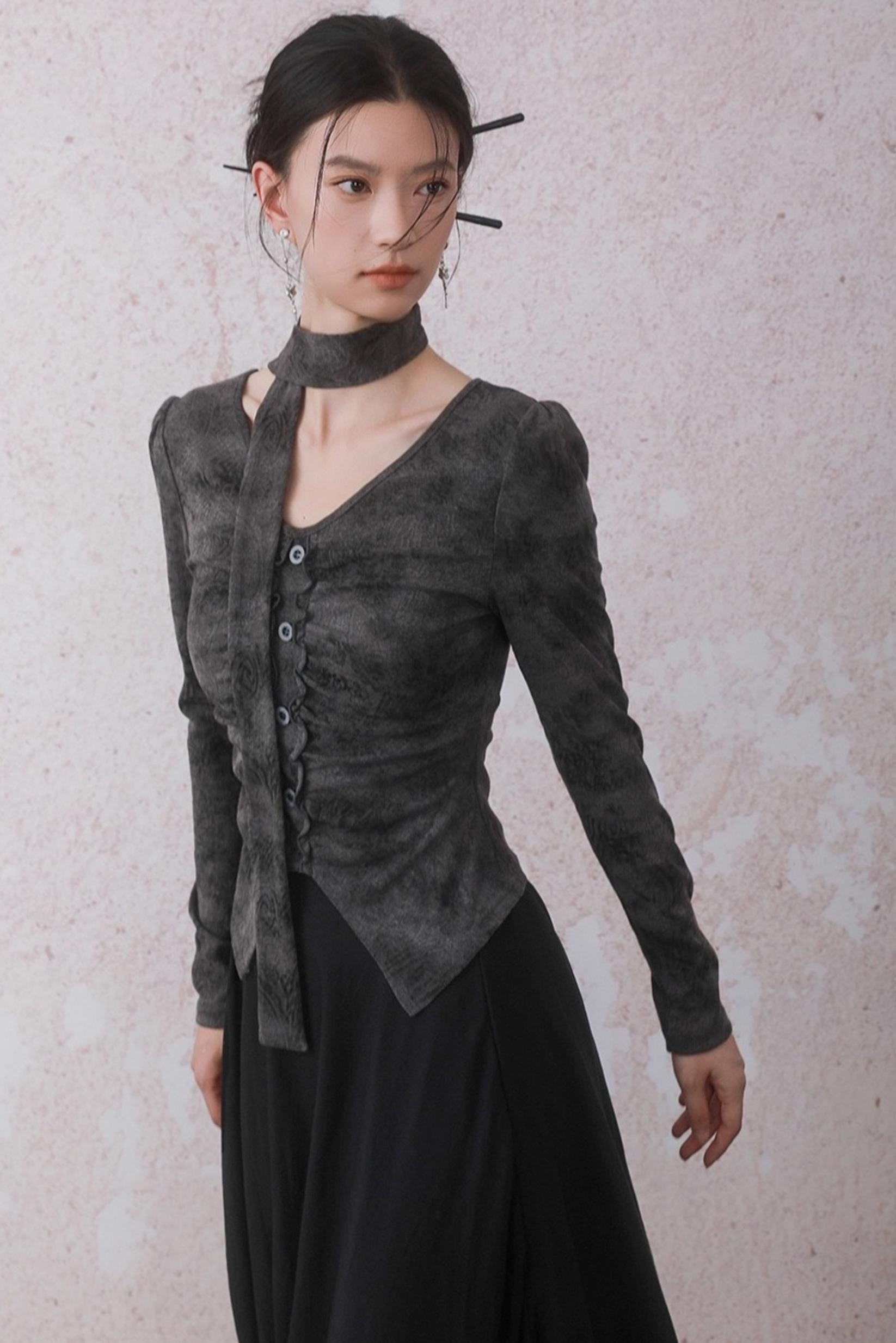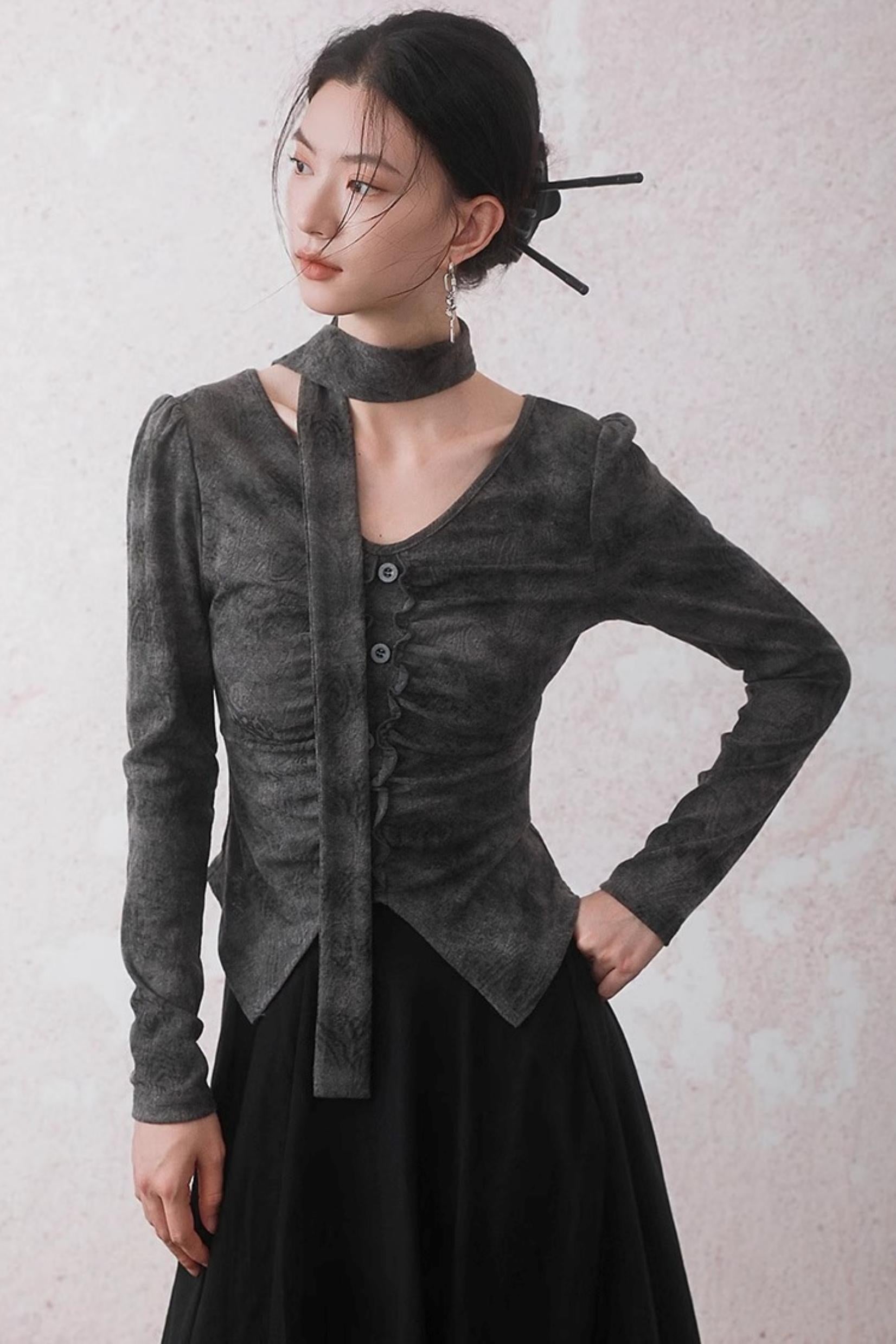 Autumn Gray Tie-dye Knitted V-Neck T-Shirt