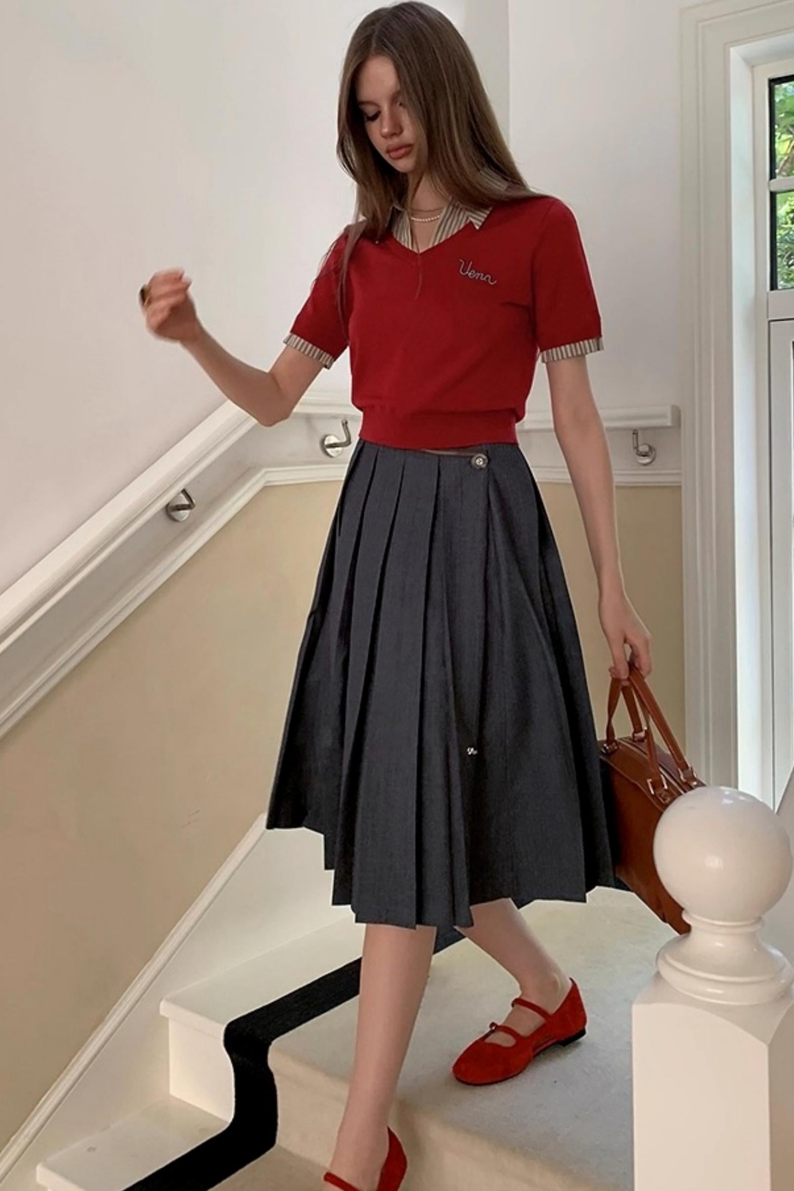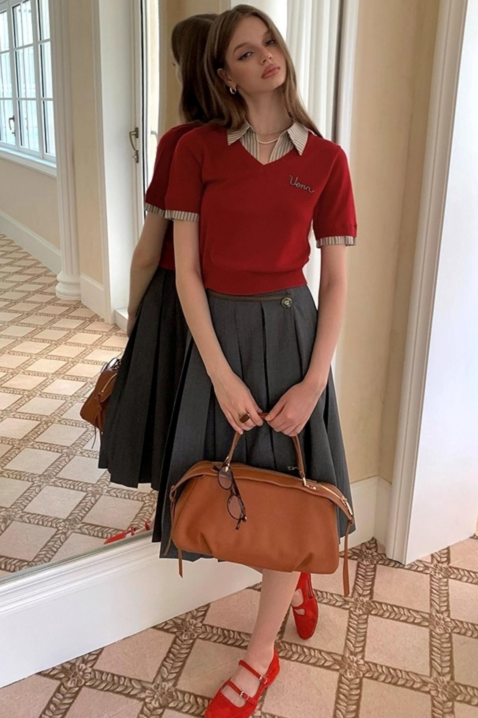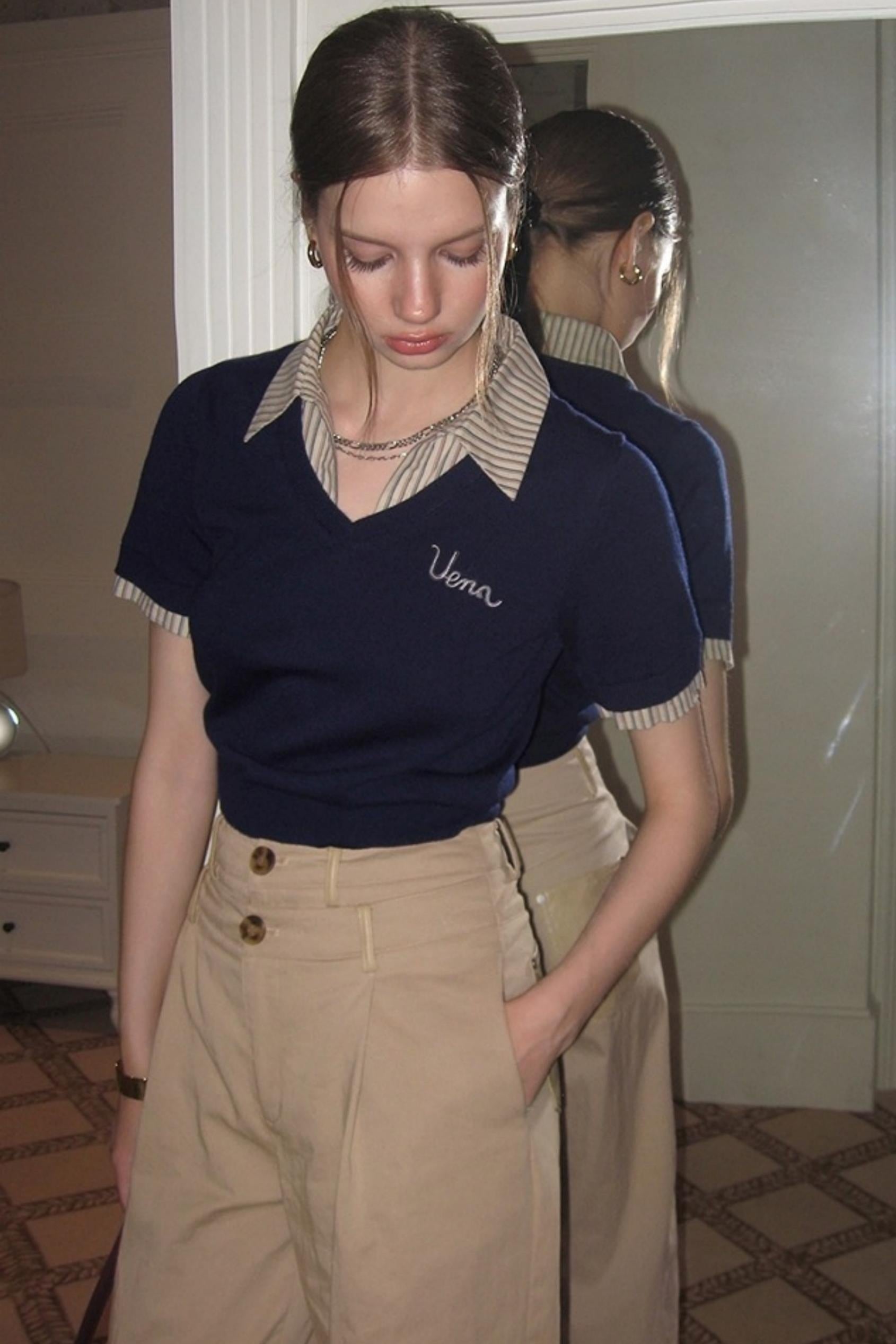 Embroidered Striped Collar Fake Two Piece T-Shirt