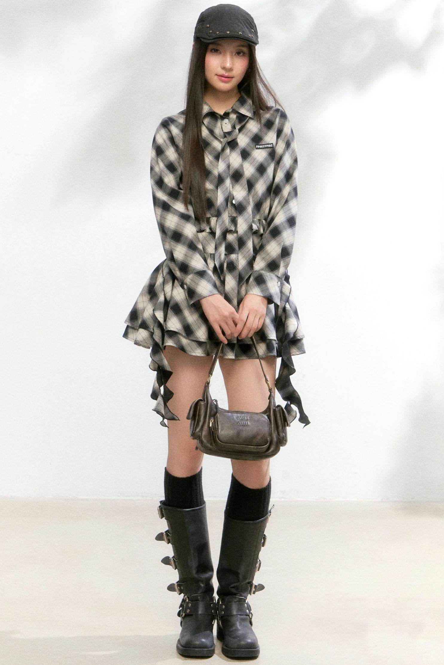 Plaid Diagonal Cut Long-Sleeved Shirt Dress