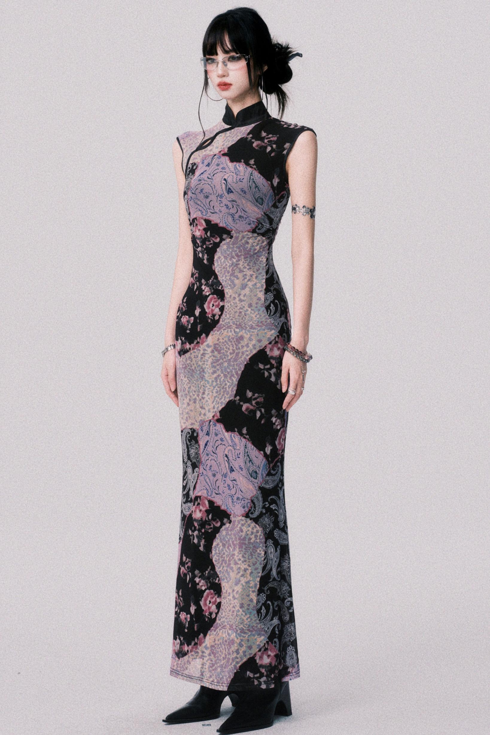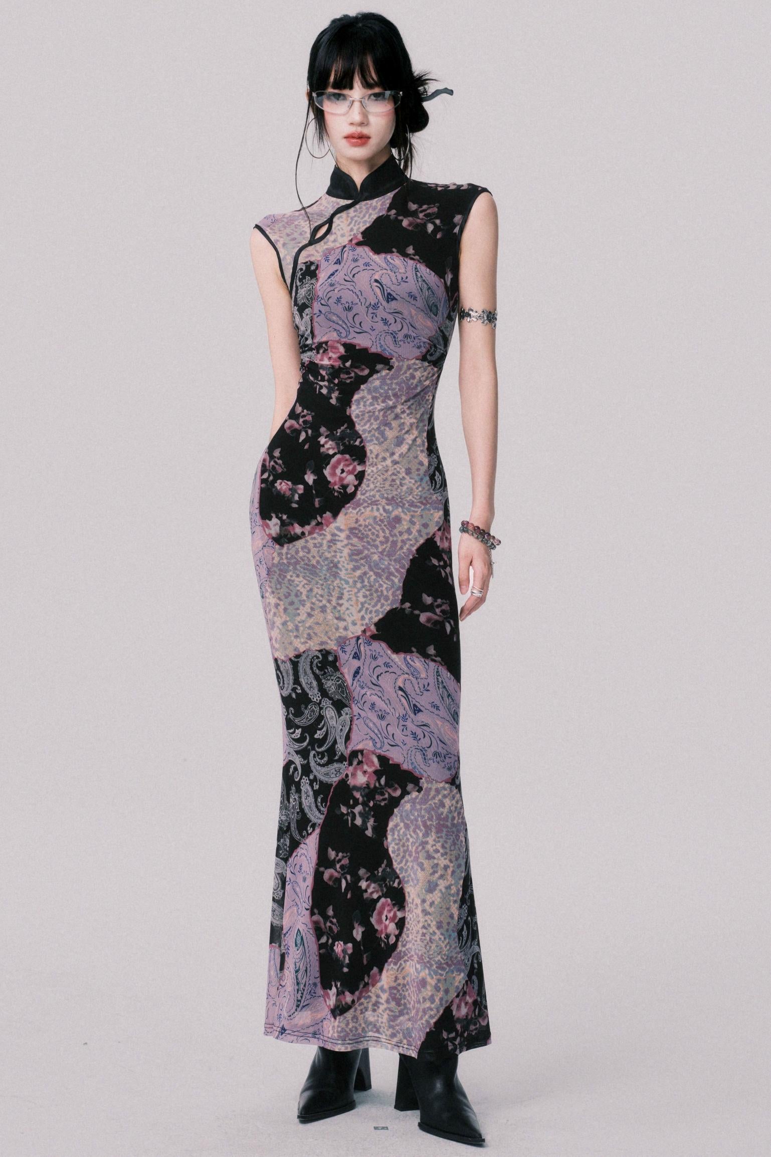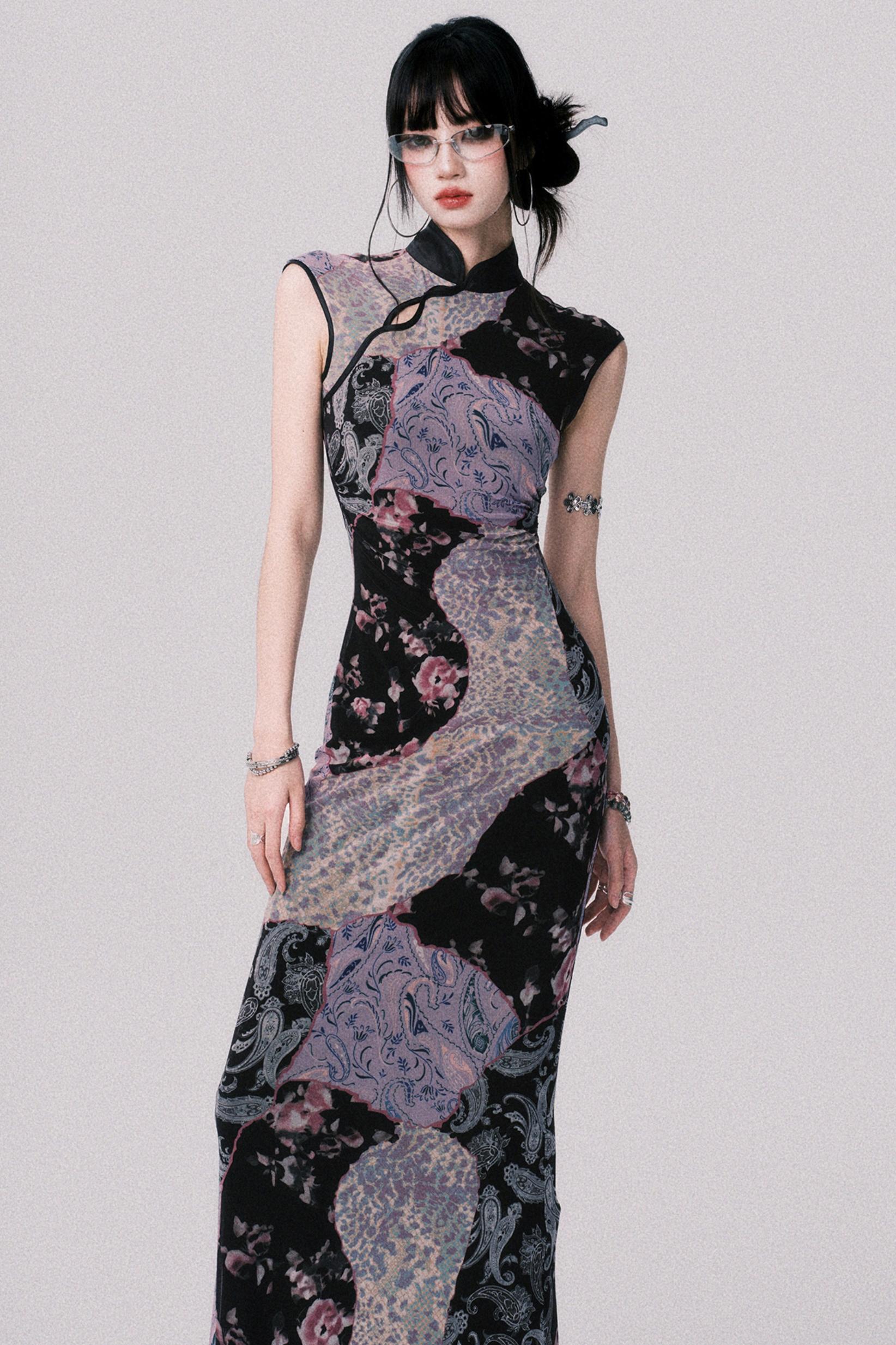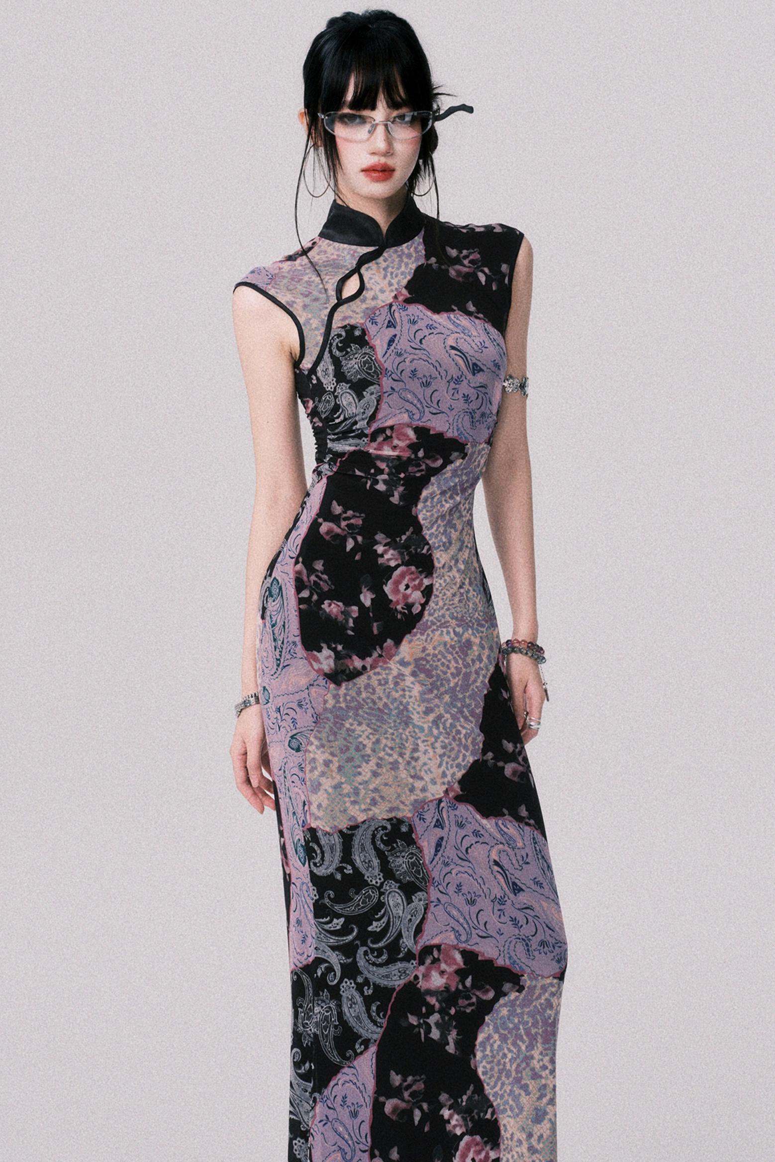 Smokey Purple Color-Blocked Cheongsam Dress