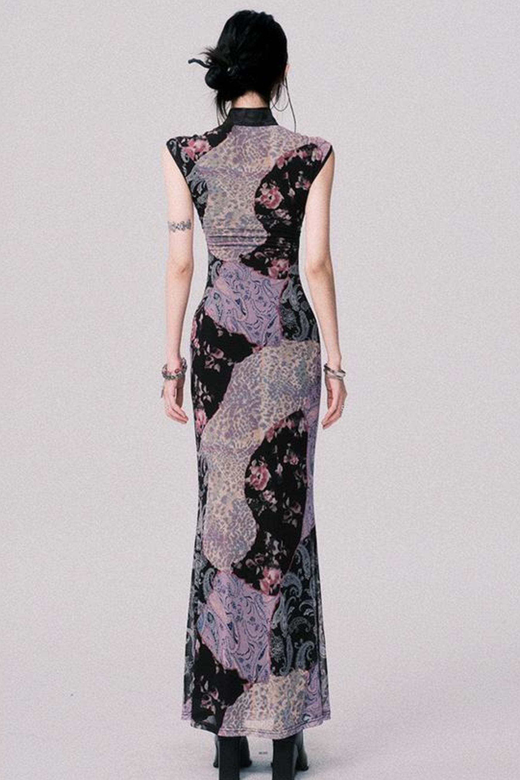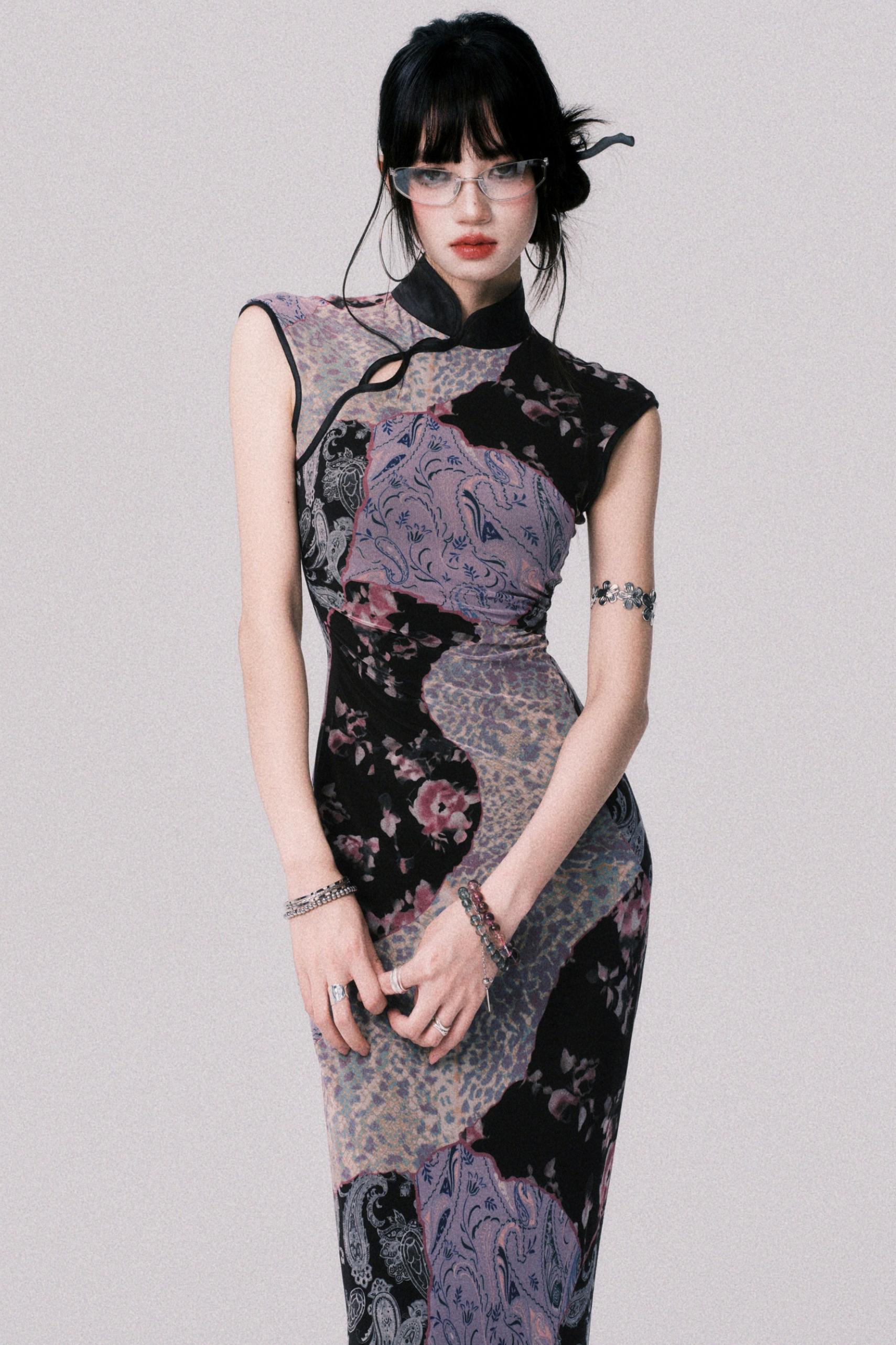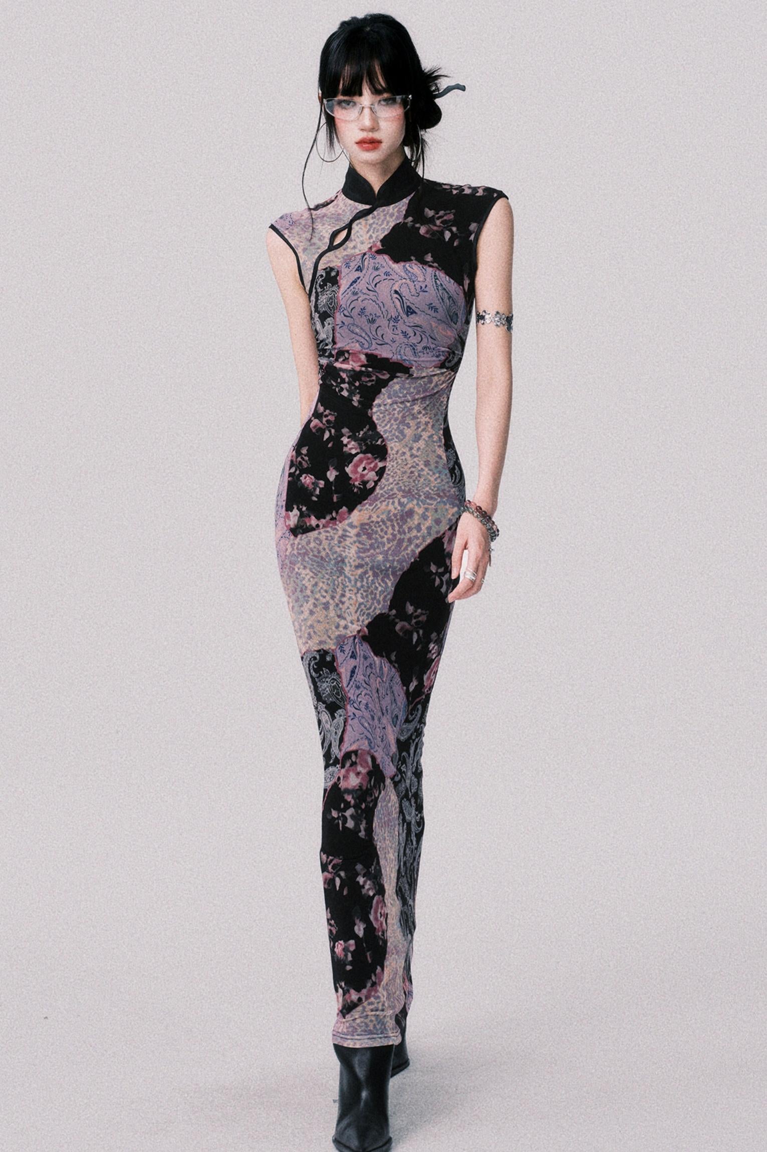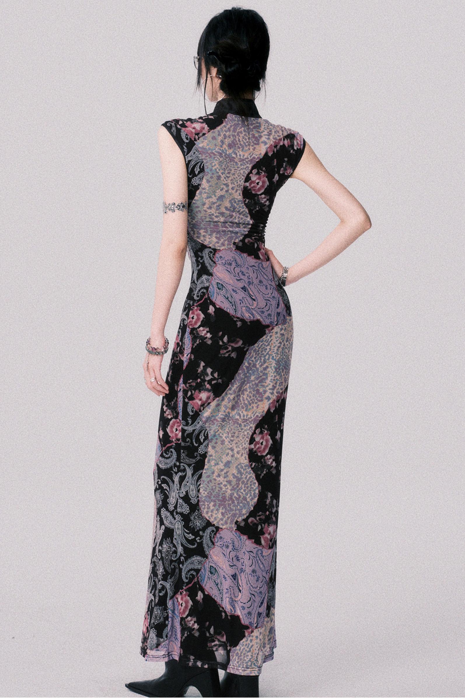 Smokey Purple Color-Blocked Cheongsam Dress