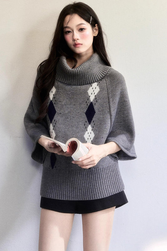 Retro Diamond Wool Knit Cape Sweater