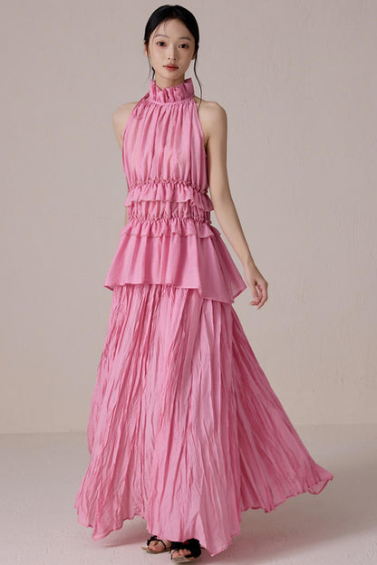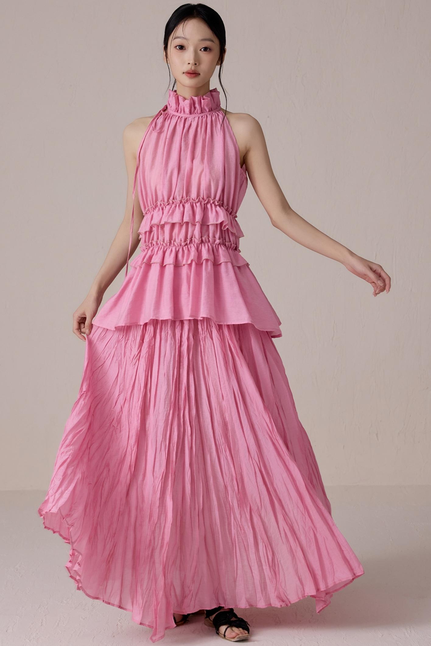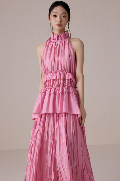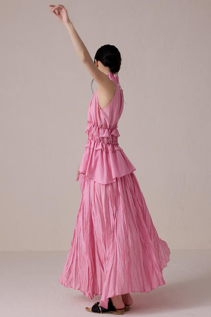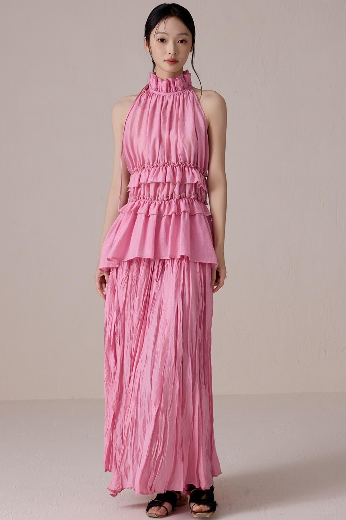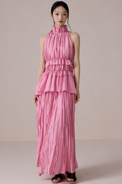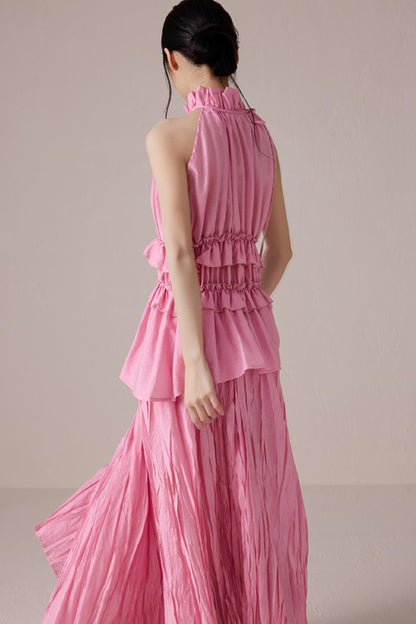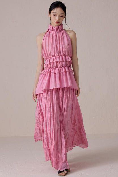 Pink Pleated Sleeveless Neck Top Set-Up
