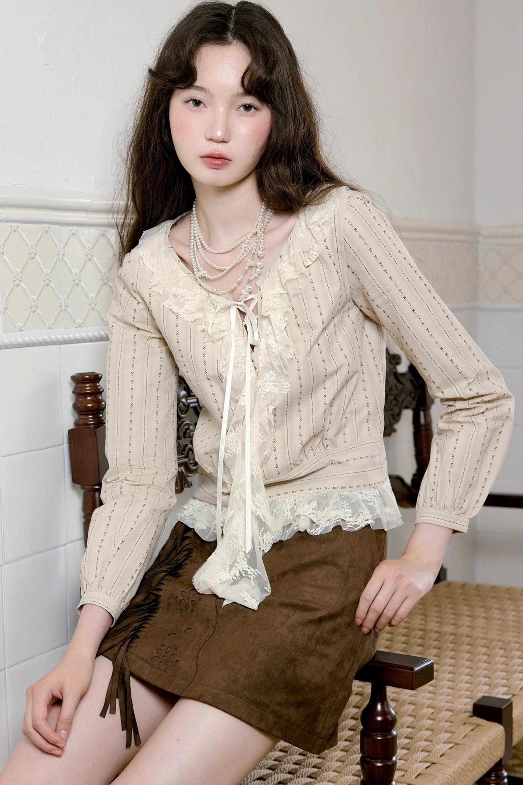 Vintage Coffee Openwork Fringed Suede A-Line Skirt