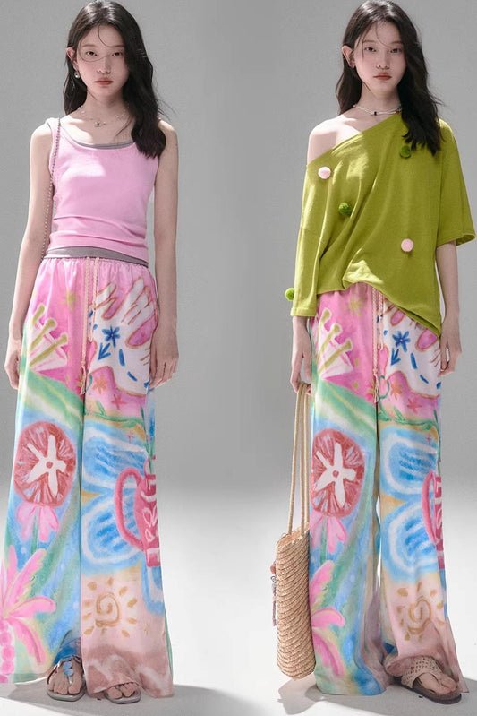 Bird and Floral Wide-Leg Pants
