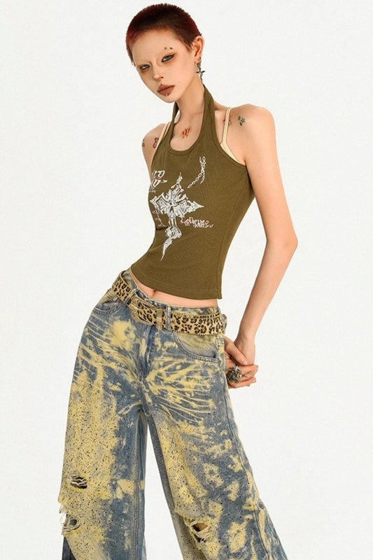 Vintage Street Print Wide-Leg Jeans