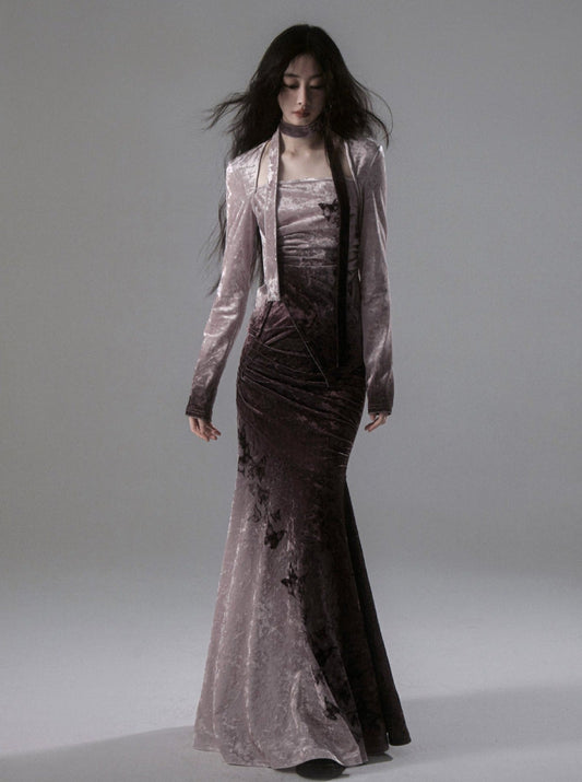 Gradient Butterfly Side Slit Velvet Set