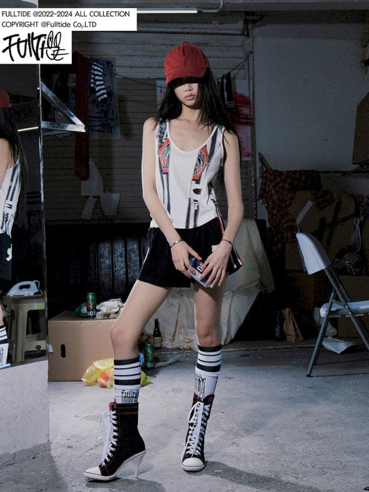 American Vintage Letter Embroidery Knit Short Sleeve T-Shirt