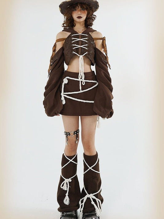 Hollow ZIP-up Hooded Top & Short Skirt