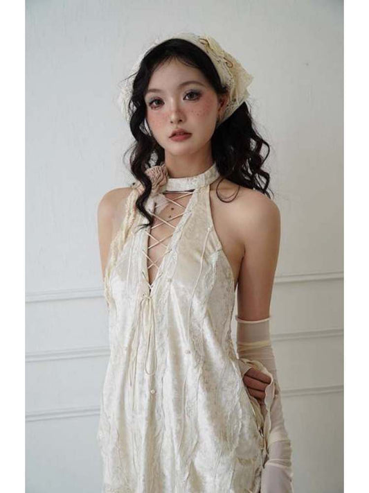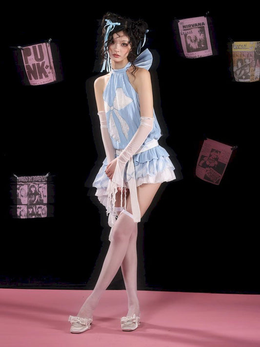 Lace-Up Halter Neck Tops & Shirring Waist Tiered Skirt
