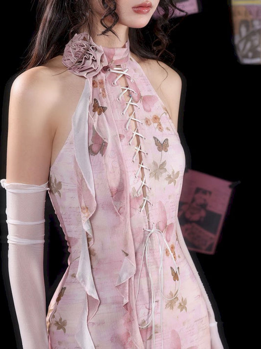 Butterfly Print Slit Tie Long Pink Cheongsam Dress