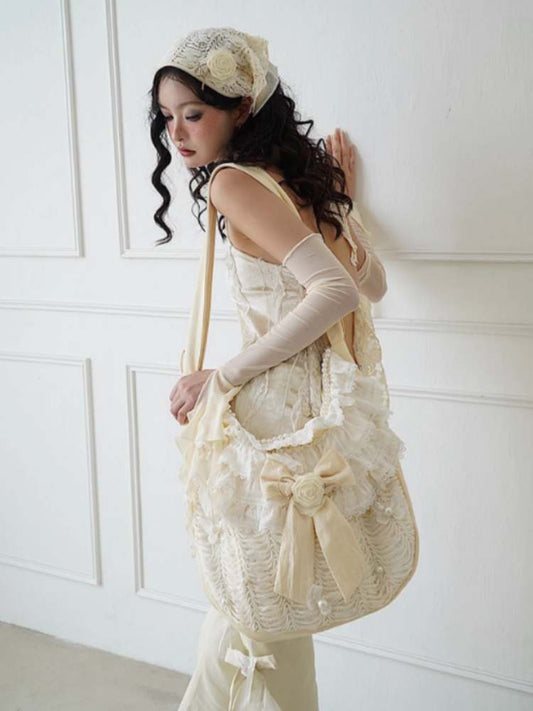 Bead & Butterfly Bowknot Canvas Ruffle Trim Crossbody Bag
