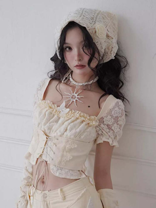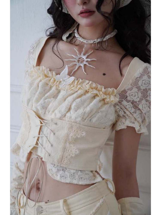 Butterfly Decorated Lace-Up Puff Sleeves Tops