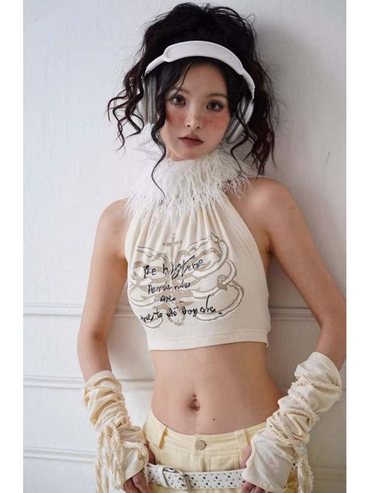 Original Printed Open Back Removable Fur Collar Tube Top Vest