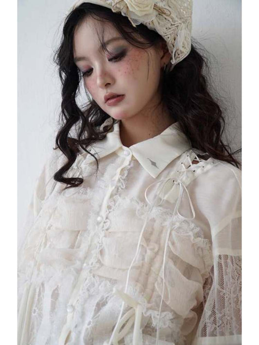 Lace-Up Crosses Embroidery Chiffon Lace Trim Shirt
