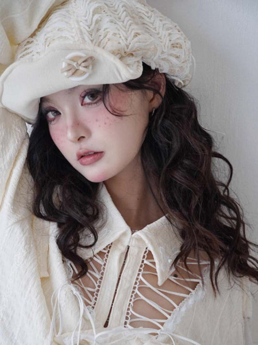 Lace-Up Bowknot & Button Beret Hat