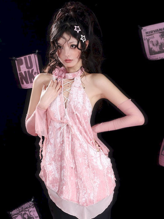 Lace-Up Flower Halter Neck Backless Tops & Sleeves Set