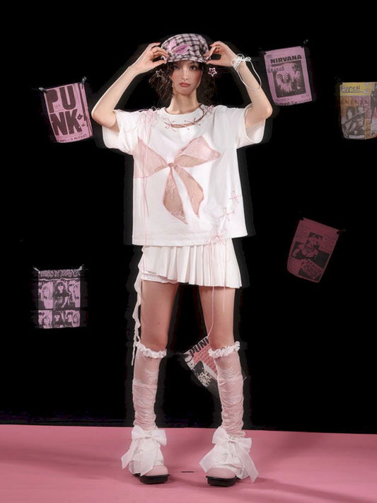 Hollow Out Tie Design White T-Shirt