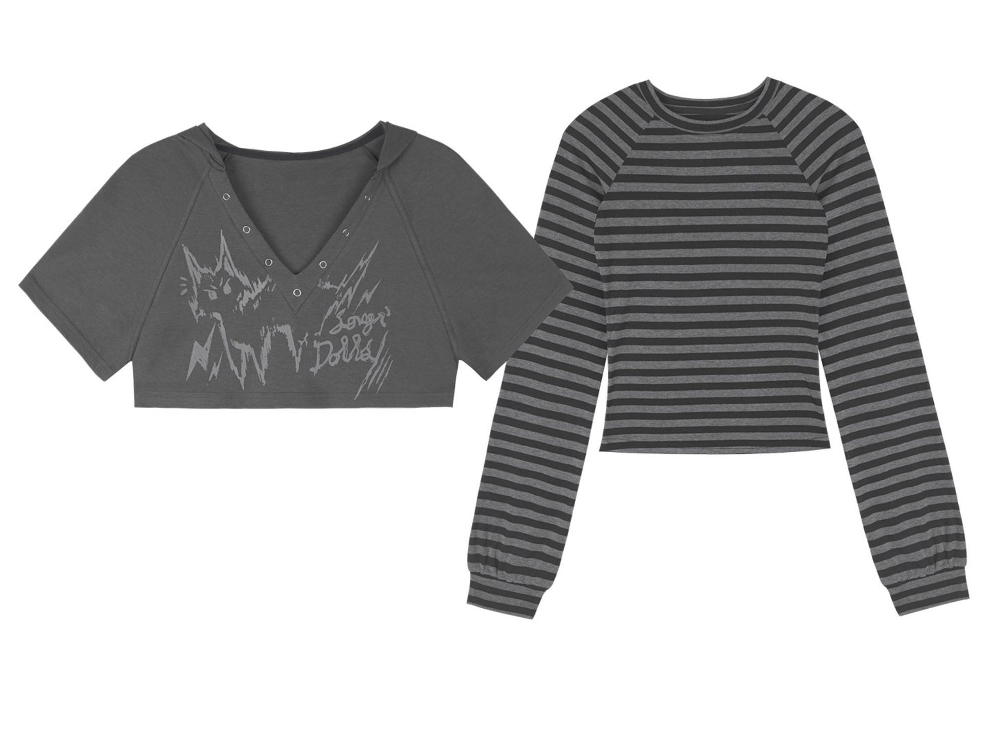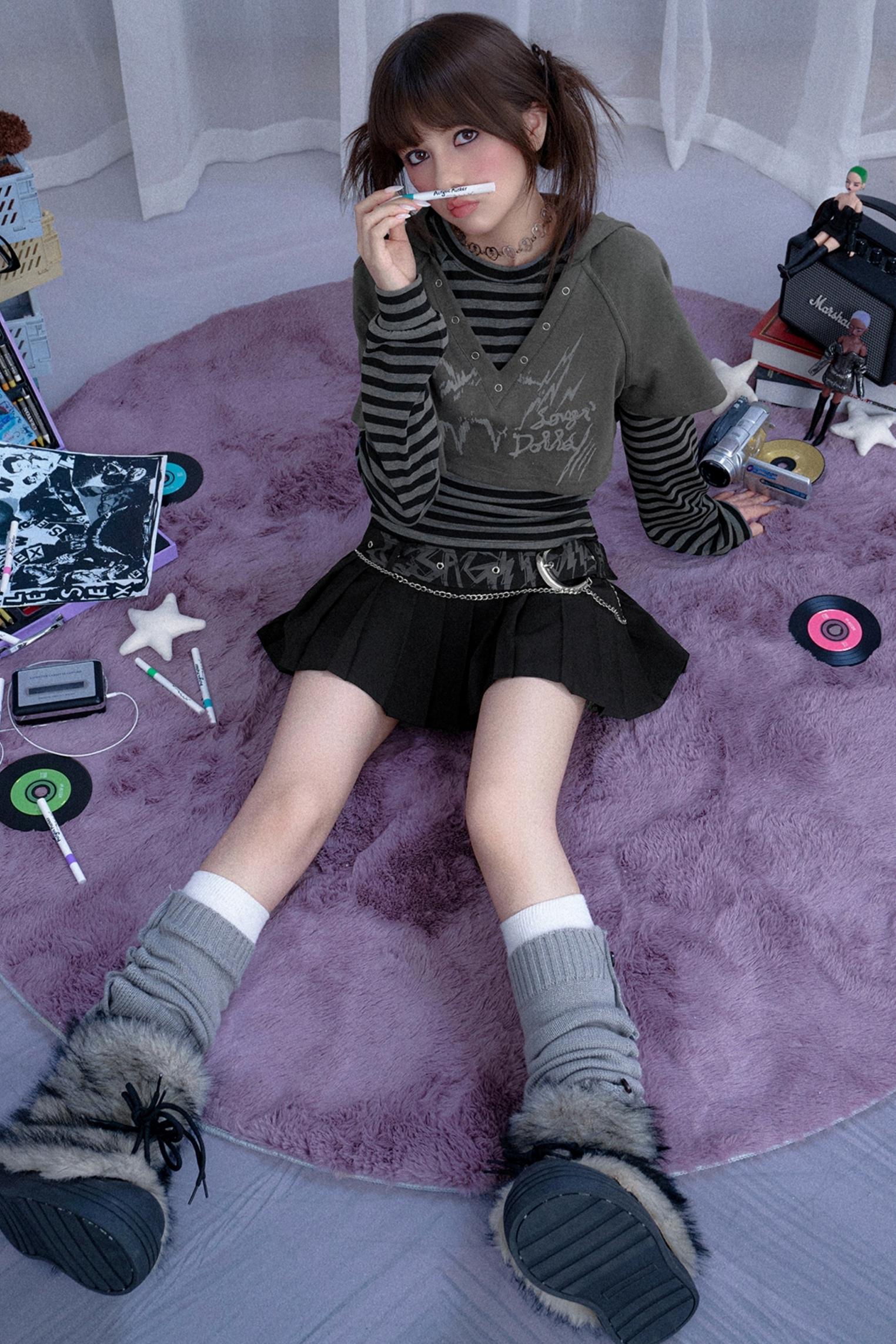 Furry Gray Striped Hooded Two-Piece Set-Up